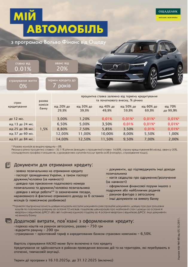 АТ КБ «ПриватБанк». Реєстраційний № 92 в Державному реєстрі банків. Банківська ліцензія НБУ № 22 від 05.10.2011. Послуга кредитування надається ПриватБанком по всій території України за винятком територій ведення активних бойових дій, АР Крим та населених пунктів, які є тимчасово окупованими та території яких є не підконтрольними органам державної влади України. Реальна річна процентна ставка з урахуванням платежів за супутні послуги (реєстрація автомобіля, оплата пенсійного збору, страхування авто) становить 32,6% річних за умови суми кредиту 5 000 000 грн., першого внеску - 20%, строку 5 років. Реальна річна процентна ставка залежить від обраних споживачем умов кредитування. Умови кредитування діють з 01 червня 2025 року. Банк залишає за собою право змінювати умови кредитування. Про детальні умови кредитування дізнавайтеся на сайті pb.ua/avtocredit. 3700 (безкоштовно з мобільного) Отримайте більше інформації https://privatbank.ua/kredyt-na-volvo